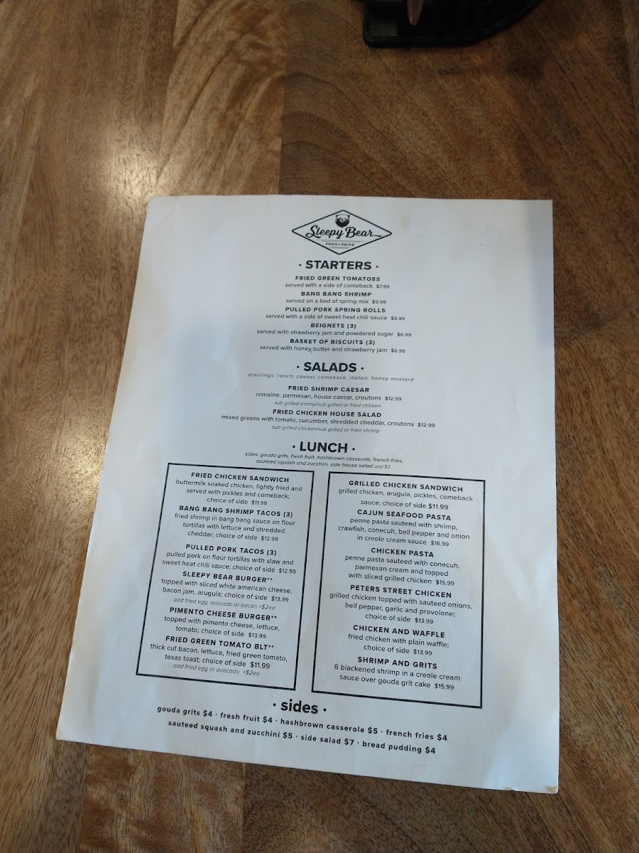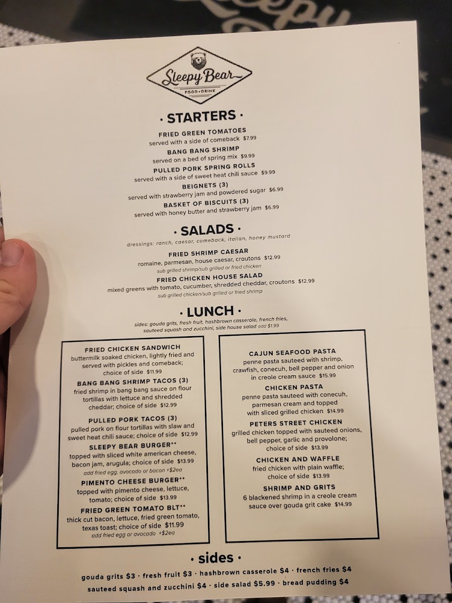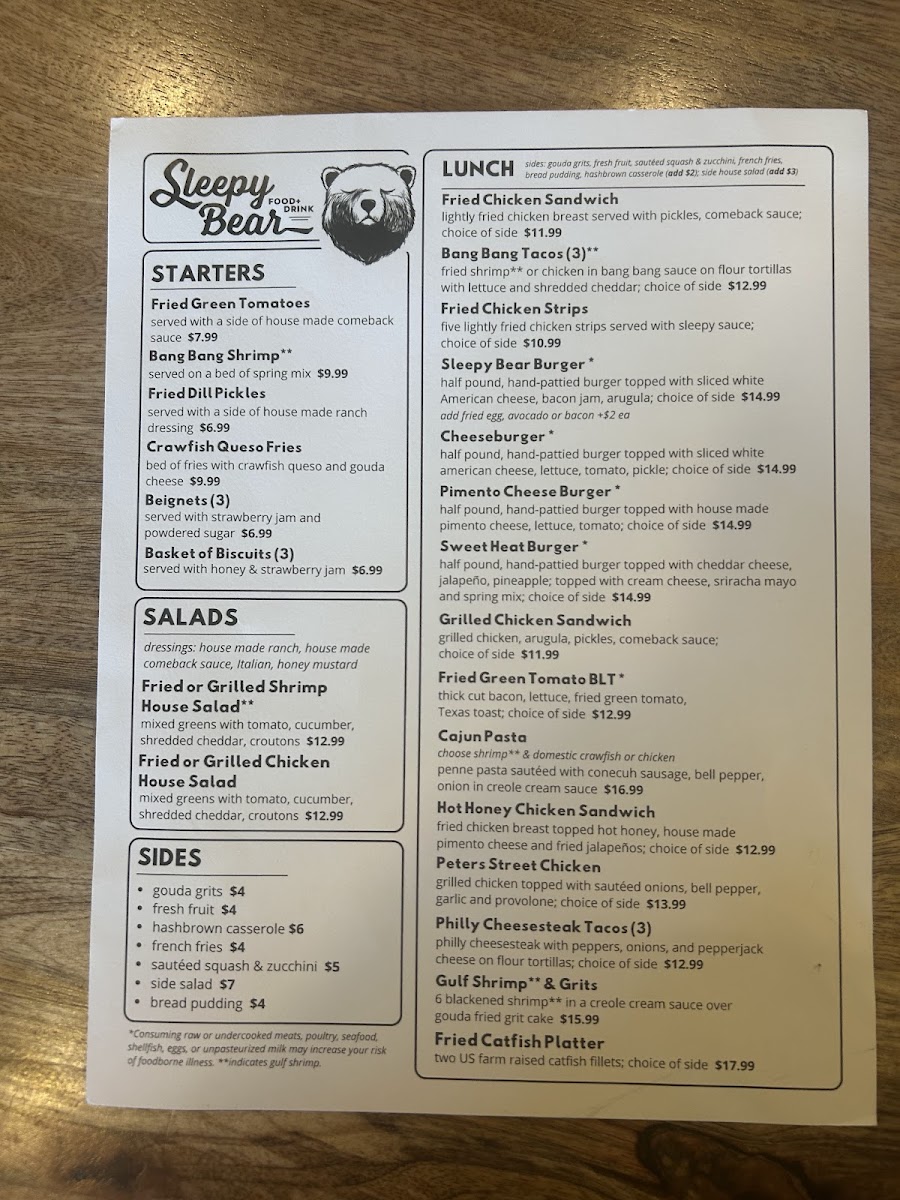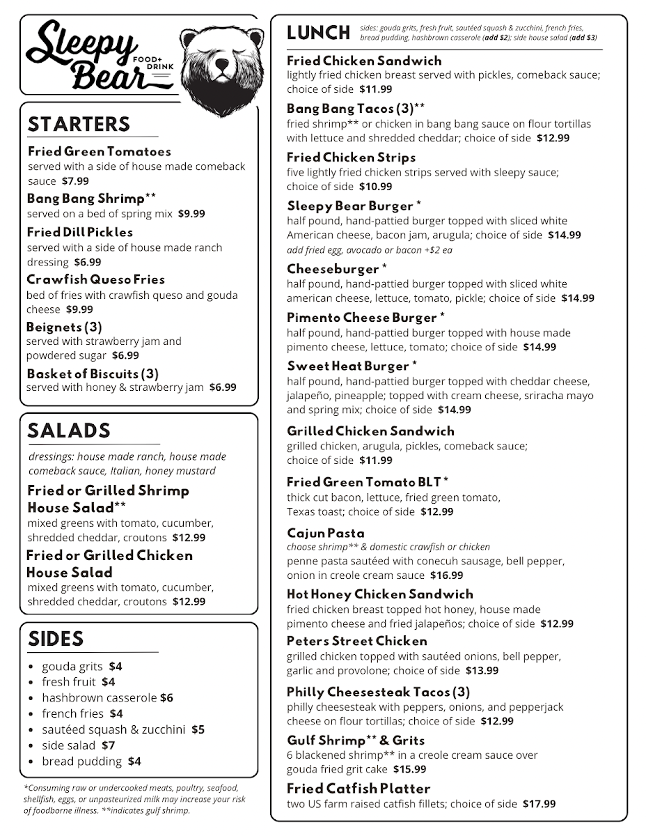 The menu at Sleepy Bear Food + Drink offers a delightful mix of comfort food with a Southern twist, perfect for any time of day. For starters, you can enjoy Fried Green Tomatoes, Bang Bang Shrimp, Fried Dill Pickles, Beignets (3), or a Basket of Biscuits (3). Salads include options like the Fried or Grilled Shrimp House Salad and the Fried or Grilled Chicken House Salad, providing a fresh and tasty choice. Lunchtime brings hearty options such as the Fried Chicken Sandwich, Bang Bang Tacos (3), Fried Chicken Strips, and the popular Sleepy Bear Burger or Pimento Cheese Burger. For breakfast, the restaurant serves up a variety of Benedicts, including the Traditional Eggs Benedict and the Cajun Benedict, alongside omelets like the Classic Omelet, Cajun Omelet, and Garden Omelet. If you're in the mood for something more substantial, their bowl options like the Rise n' Shine, Spicy Southern, Gritty Bird, and Philly Fire deliver bold flavors to start or end your day on a high note.