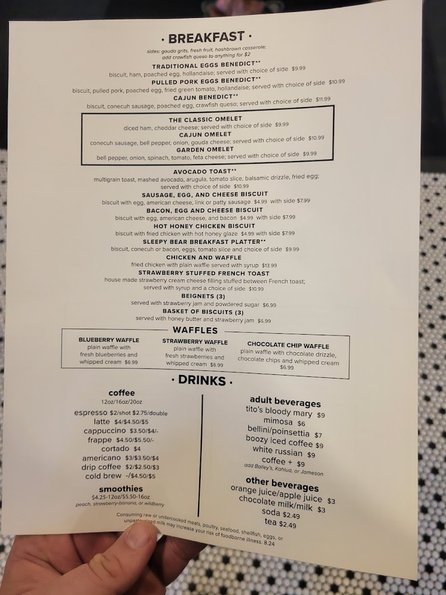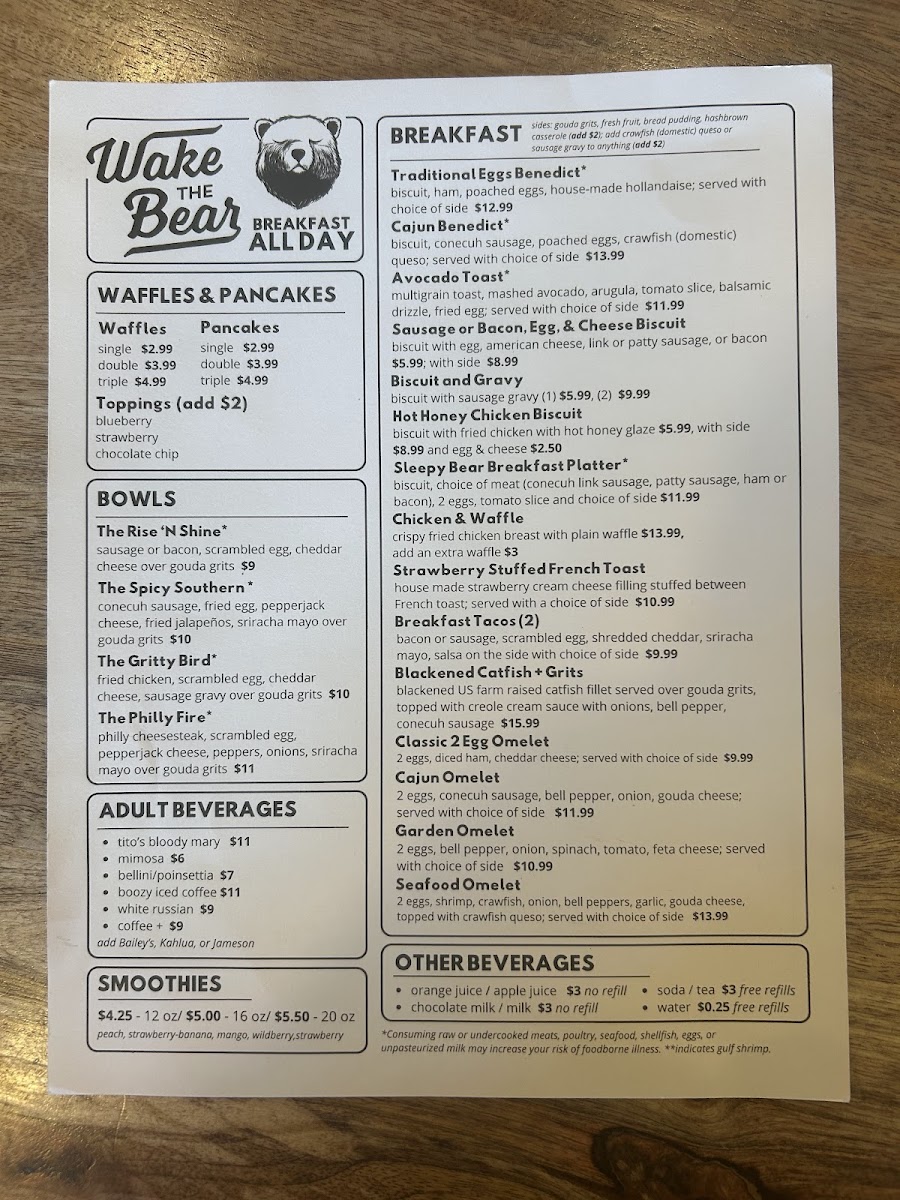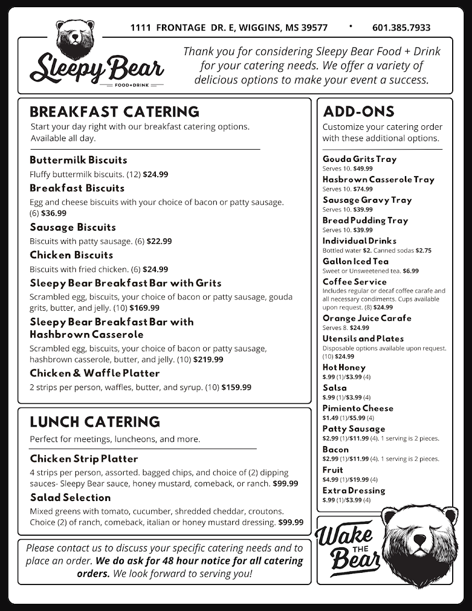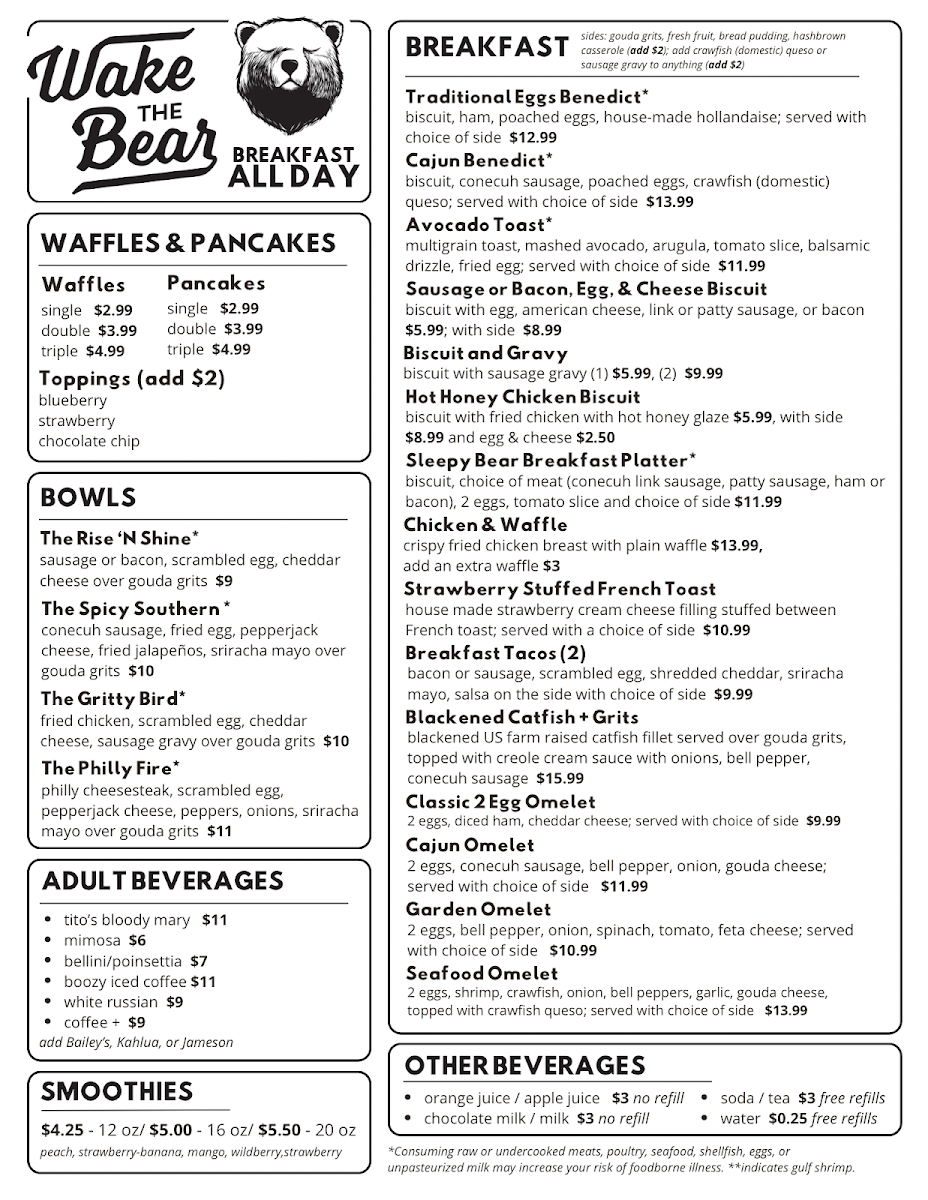 The menu at Sleepy Bear Food + Drink offers a delightful mix of comfort food with a Southern twist, perfect for any time of day. For starters, you can enjoy Fried Green Tomatoes, Bang Bang Shrimp, Fried Dill Pickles, Beignets (3), or a Basket of Biscuits (3). Salads include options like the Fried or Grilled Shrimp House Salad and the Fried or Grilled Chicken House Salad, providing a fresh and tasty choice. Lunchtime brings hearty options such as the Fried Chicken Sandwich, Bang Bang Tacos (3), Fried Chicken Strips, and the popular Sleepy Bear Burger or Pimento Cheese Burger. For breakfast, the restaurant serves up a variety of Benedicts, including the Traditional Eggs Benedict and the Cajun Benedict, alongside omelets like the Classic Omelet, Cajun Omelet, and Garden Omelet. If you're in the mood for something more substantial, their bowl options like the Rise n' Shine, Spicy Southern, Gritty Bird, and Philly Fire deliver bold flavors to start or end your day on a high note.